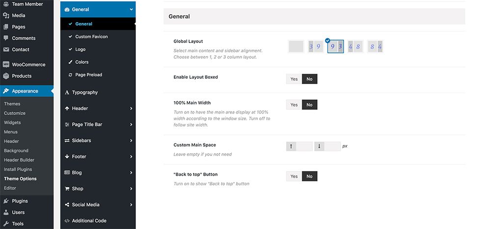 | Custom Page Layout | Select main content and sidebar alignment. Choose between 1, 2 or 3 column layout. |