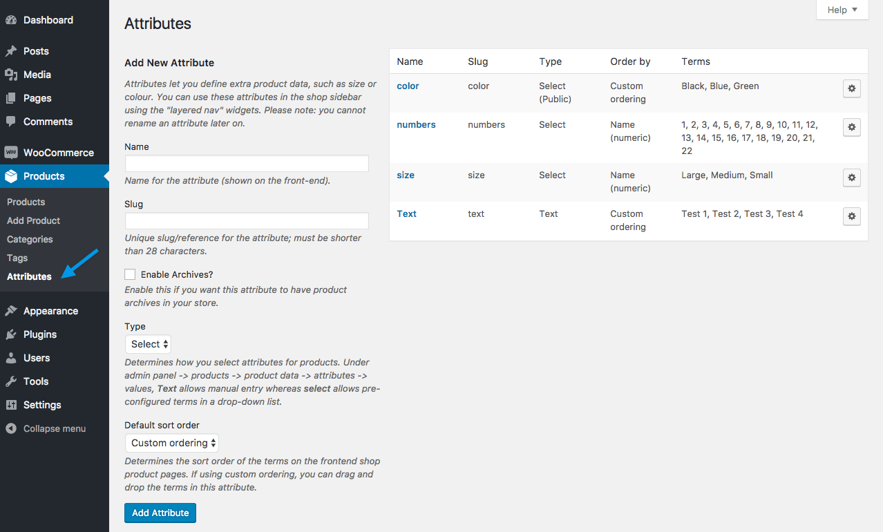 1. Go to: Products > Attributes.