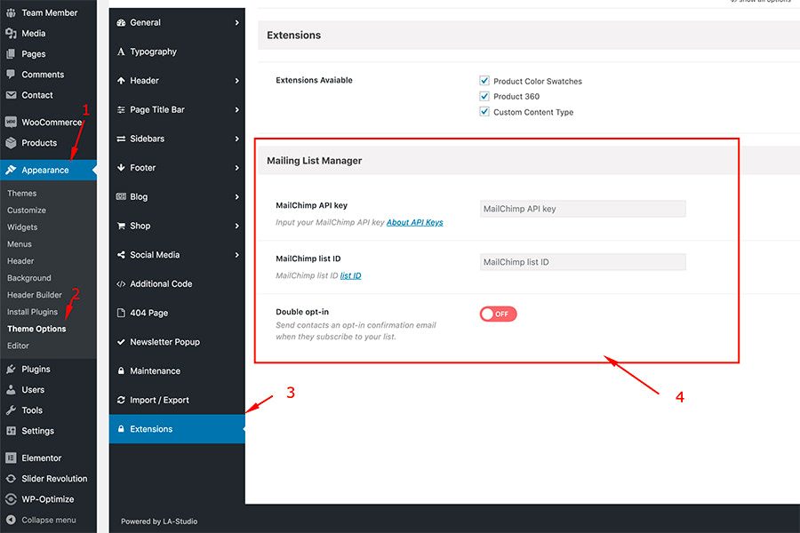 Please go to Appearance> -> Theme Options -> Extensions -> Mailing List Manager