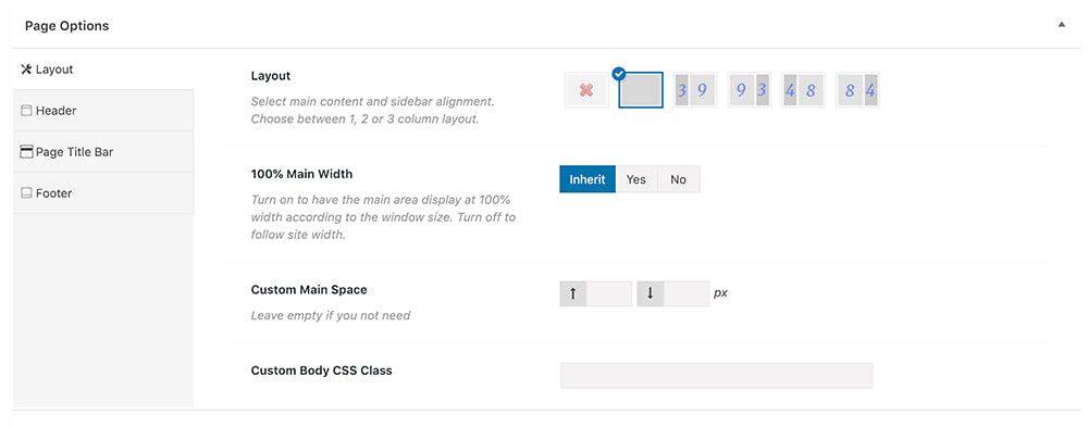 | Custom Page Layout | Select main content and sidebar alignment. Choose between 1, 2 or 3 column layout. |