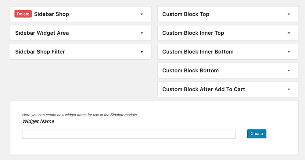 In this section you can do all things about widgets on your site(create, delete, update). Have 7 widget areas, included: Main Sidebar, Shop Filter Sidebar, Custom Block Top, Custom Block Inner Top, Custom Block Inner Bottom, Custom Block Bottom, Custom Block After Add To Cart