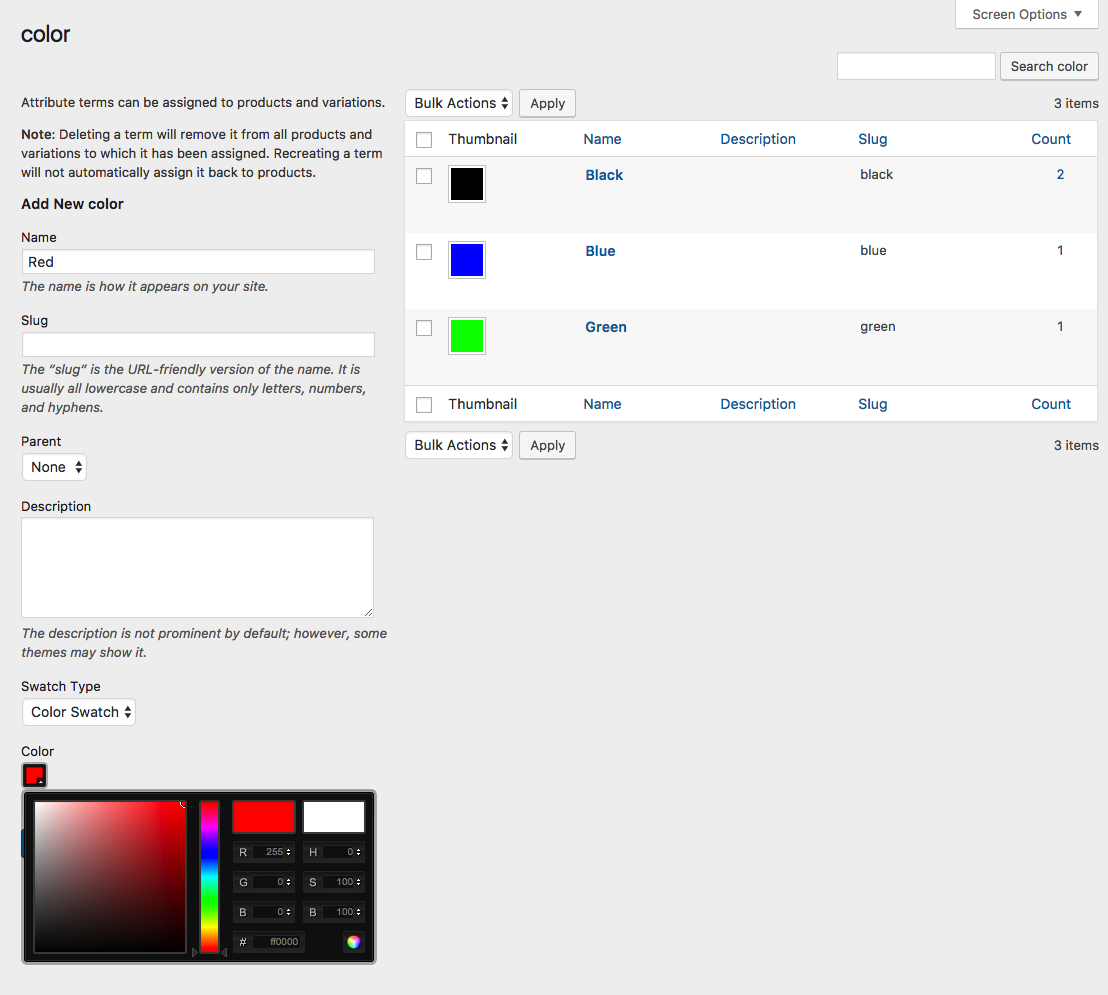 4. Add New Color or whatever your attribute is called (or choose to edit an existing term).
